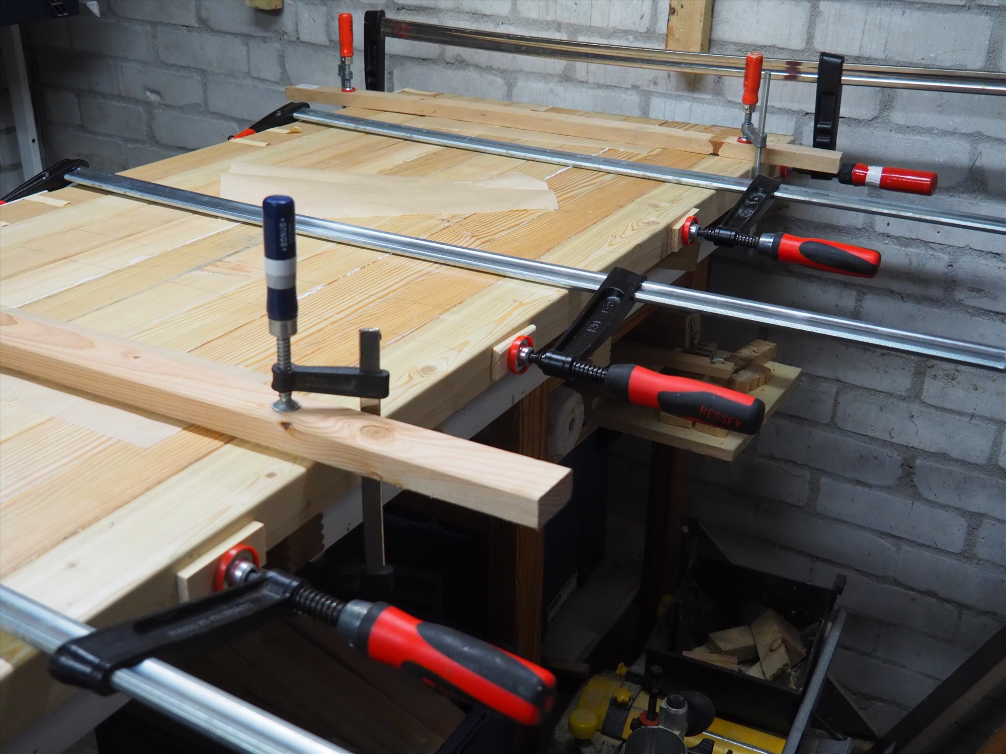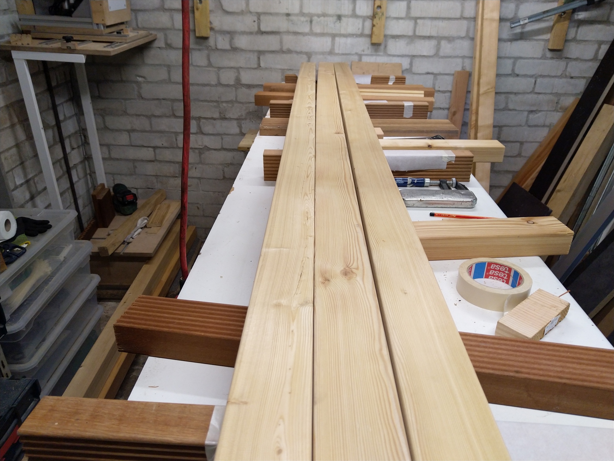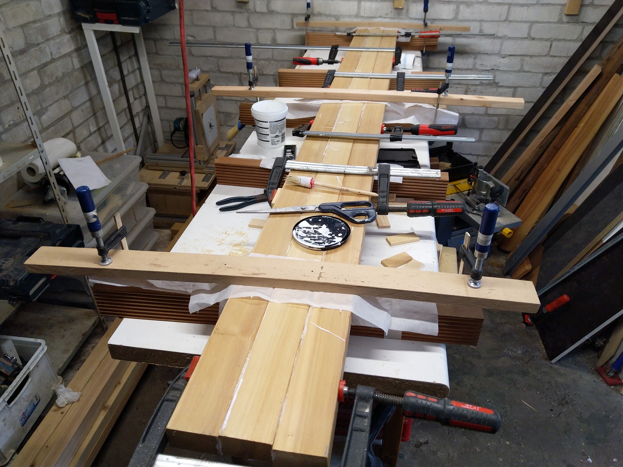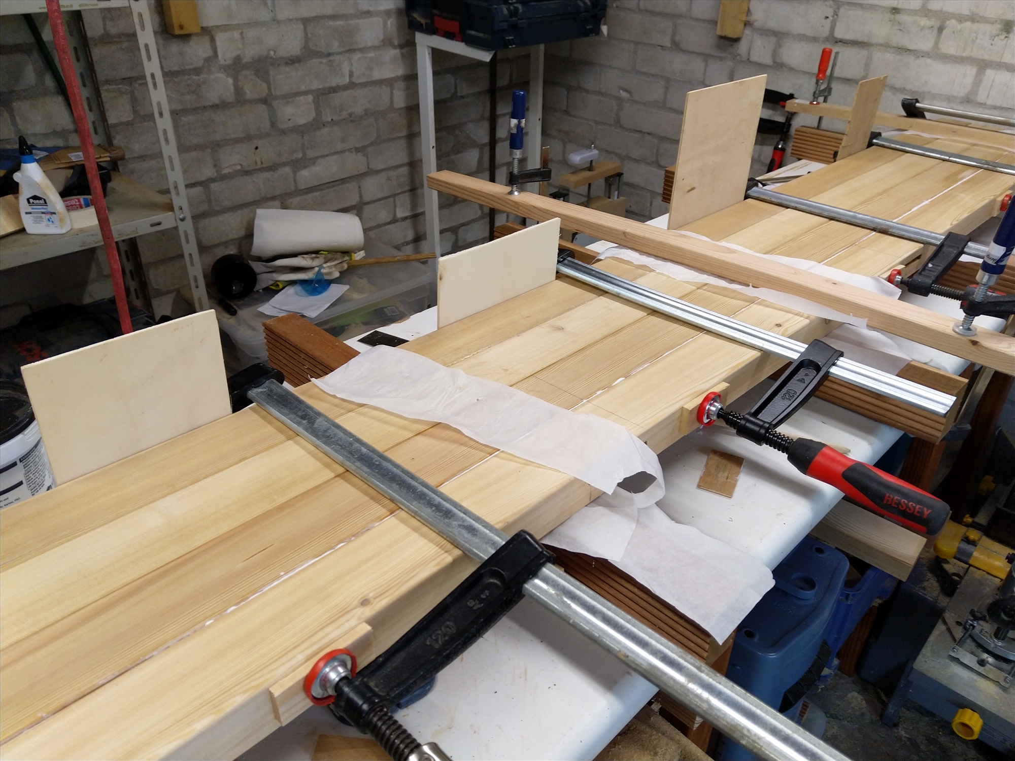 Da mein Schuppen zu klein ist und ich nur ein begrenzte Anzahl von Zwingen habe brauche ich drei Tage. Für jeden Abschnitt einen.