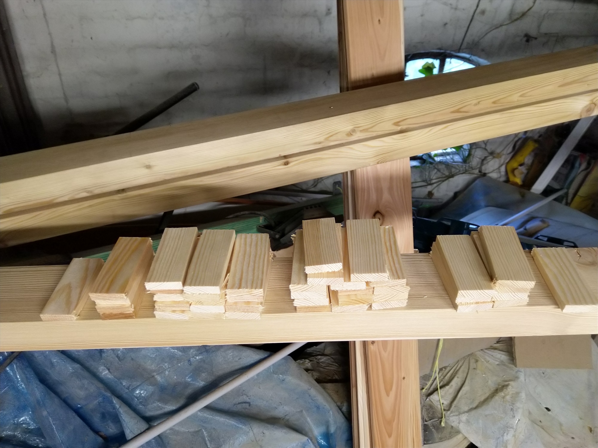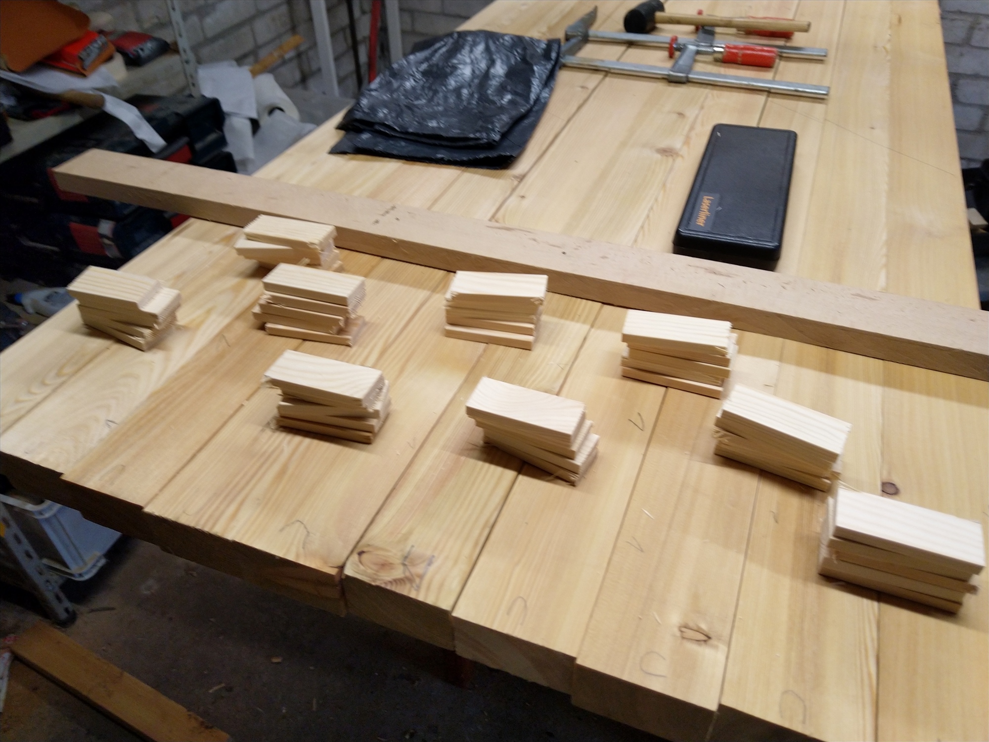 Nachdem ich noch zweimal beim Holzhandel war, mehr Latten gekauft habe, ein paar zur Seite gestellte habe, habe ich meine 10 Lamellen zusammen.