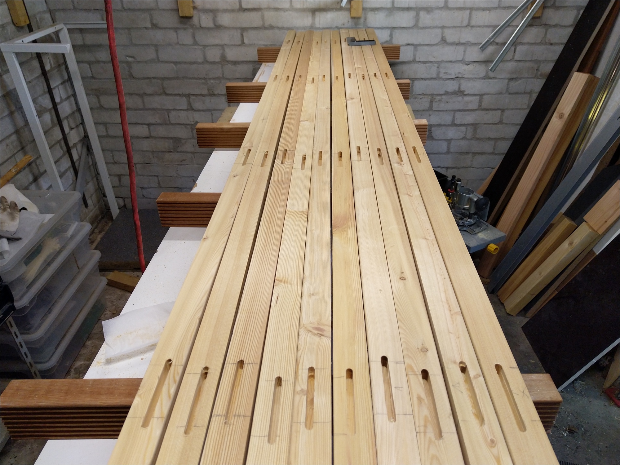 Alle Lamellen von 45 auf 41mm runtergehobelt. So verzwungen sieht es schon richtig nach was aus.