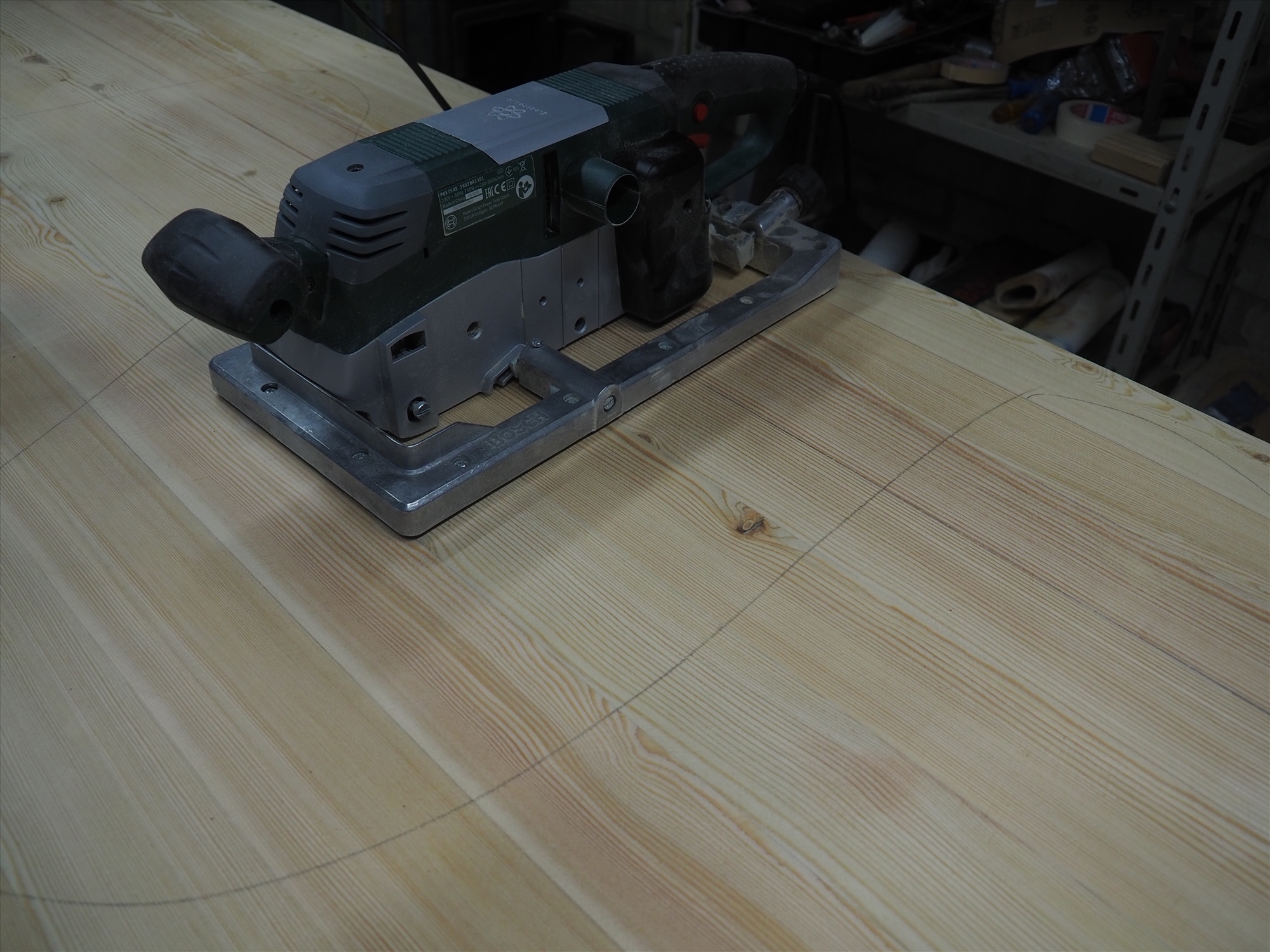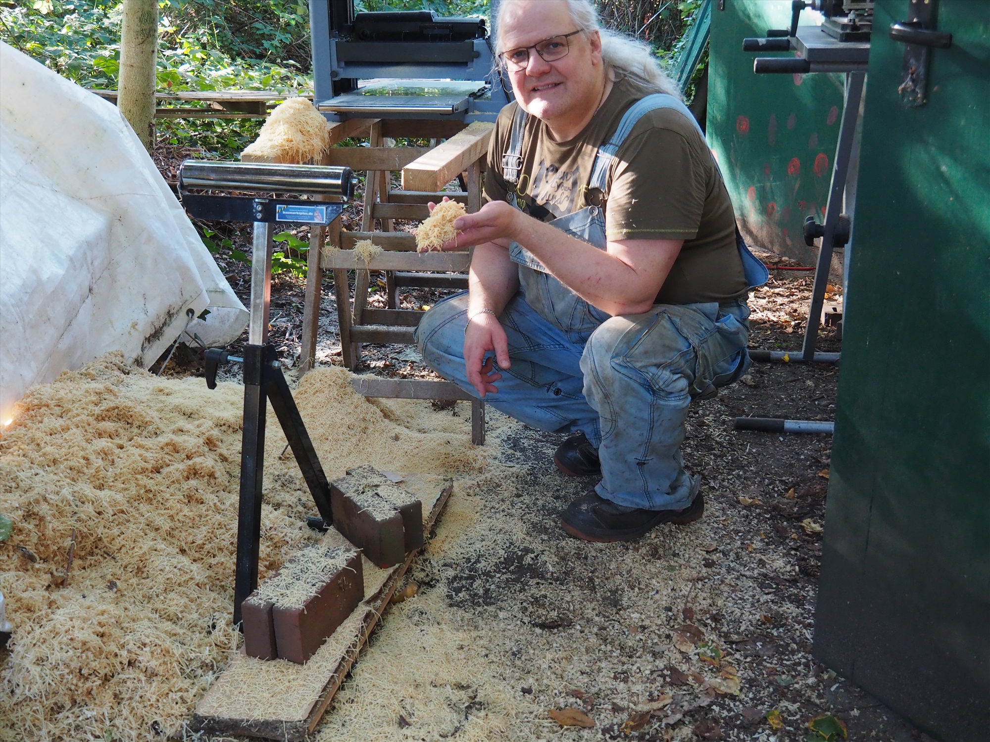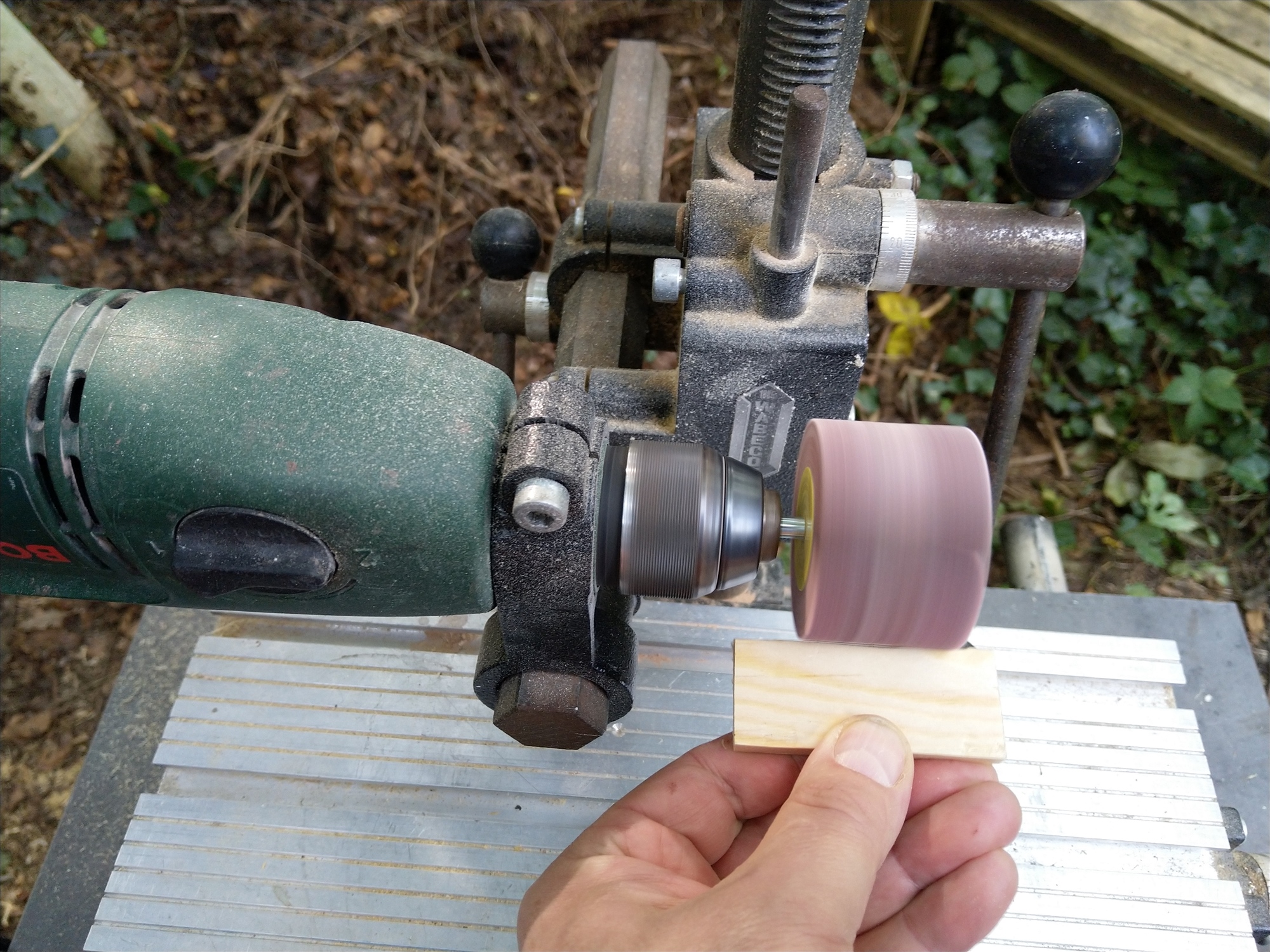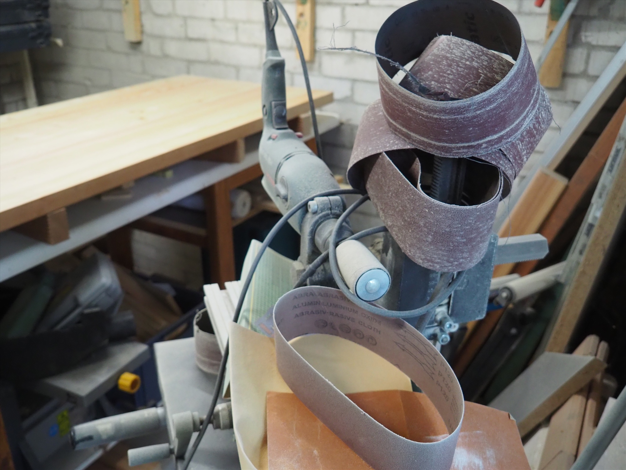 Also mache ich es wie Guido Henn (Holzwerken TV). Mit einem Bandschleifer im Führungsschlitten (Bosch PBS 73AE)...