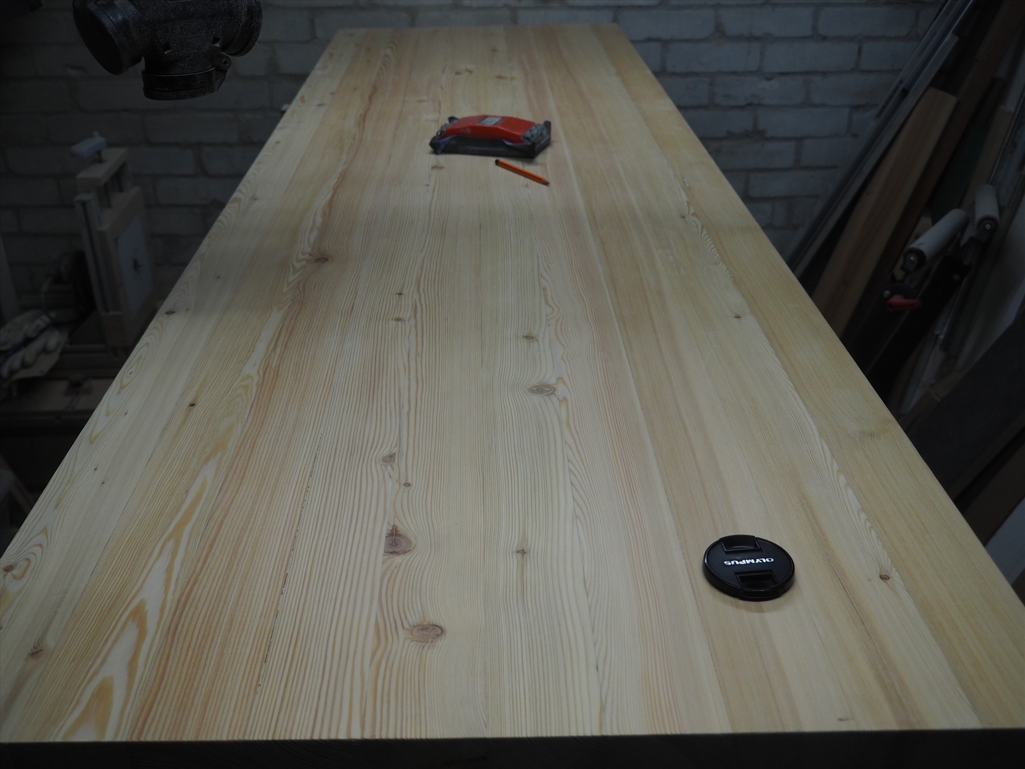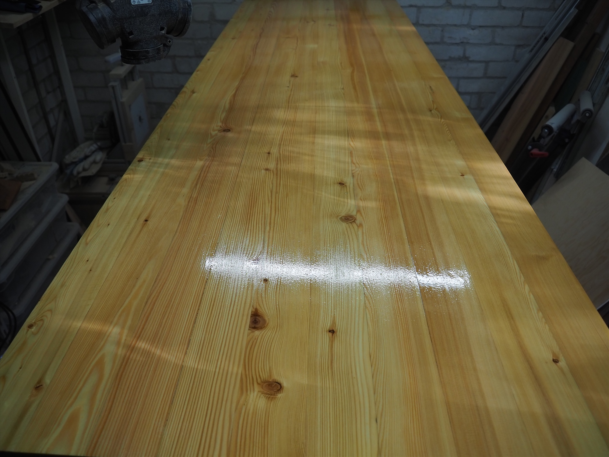 Tja, nach Wochen des ölens und wartens nun die ernüchternde Erkenntnis. Alles klebt! Ich habe wohl zu viel Öl auf der Oberfläche stehen lassen. Besonders das Tungöl gibt einen richtigen, wenn auch harten, Schleier. Das ist sehr enttäuschend. Nach erfolglosen Versuchen mit Orangenschalen-Öl die Klebe wegzuwischen sehe ich mich gezwungen die Platte abzuschleifen ...